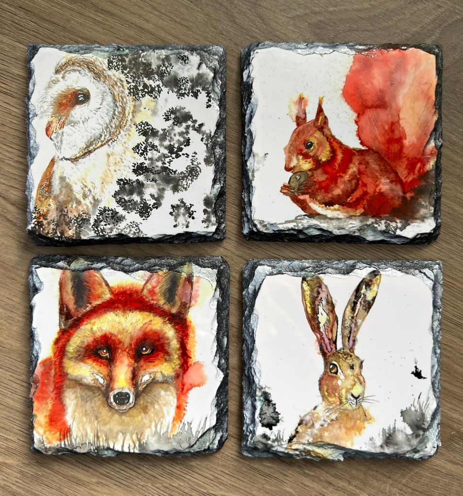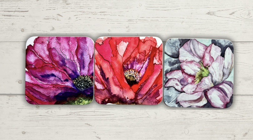 Choose from hard-backed, slate or glass — each coaster beautifully printed with my original designs and finished to a high standard. Add my table mats to complete the look. Practical as well as eye-catching, they protect your surfaces while adding a touch of art to your home.