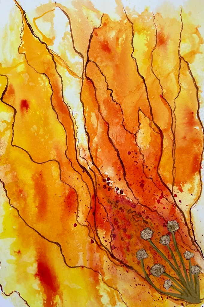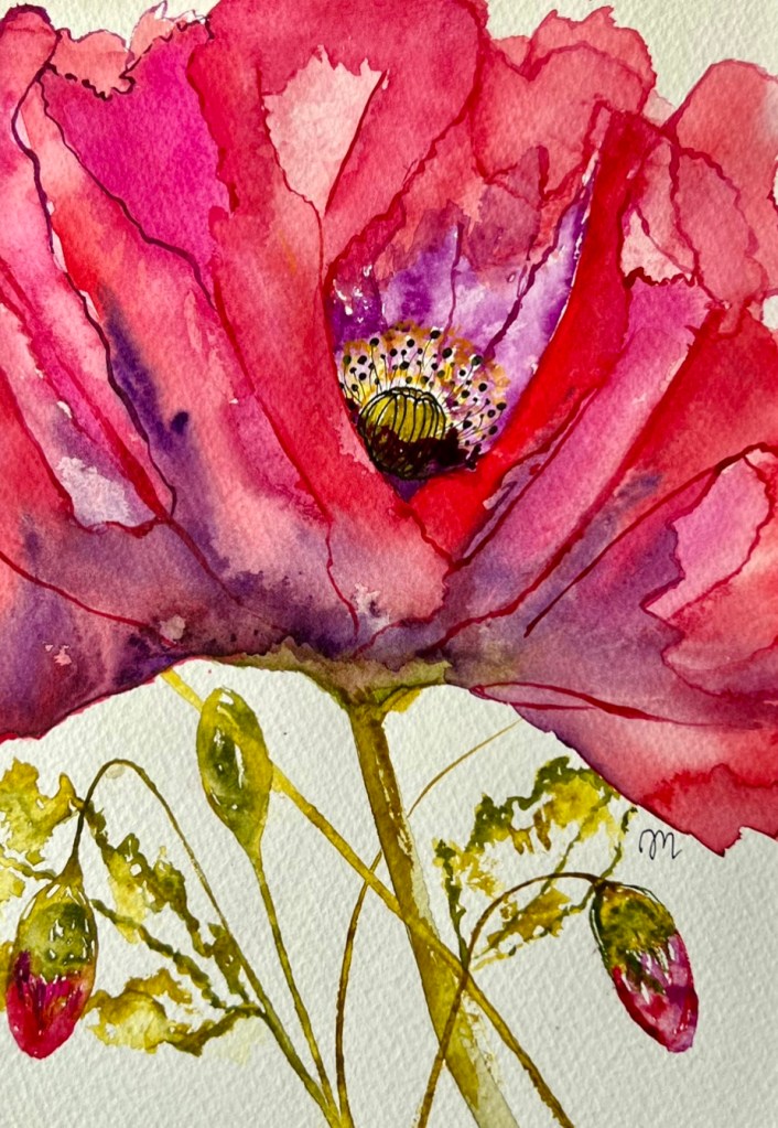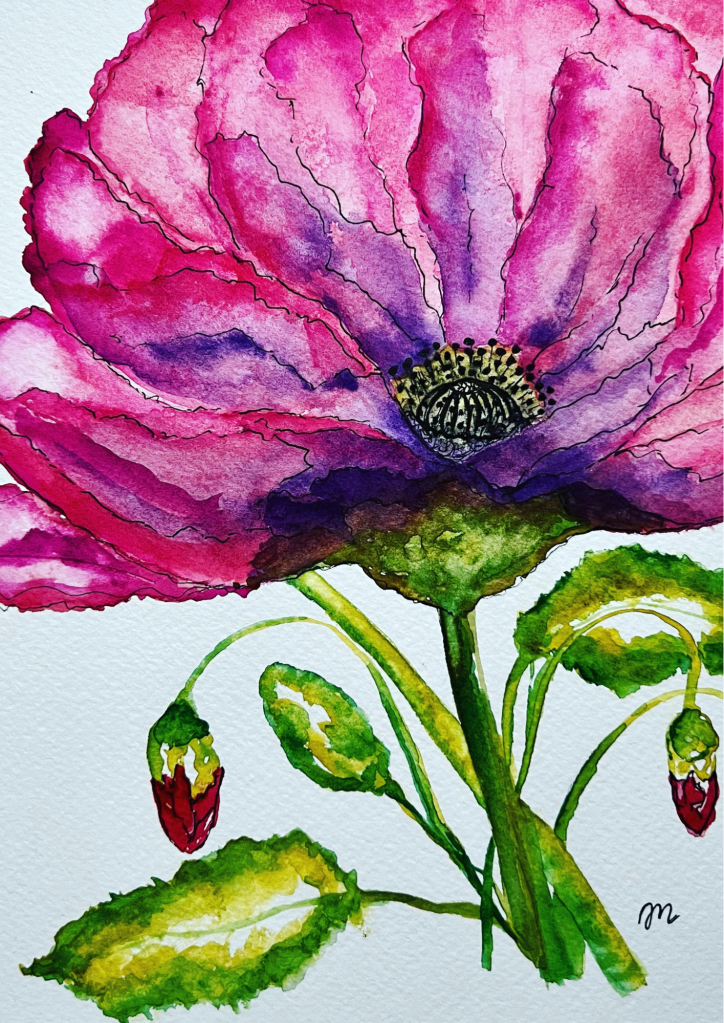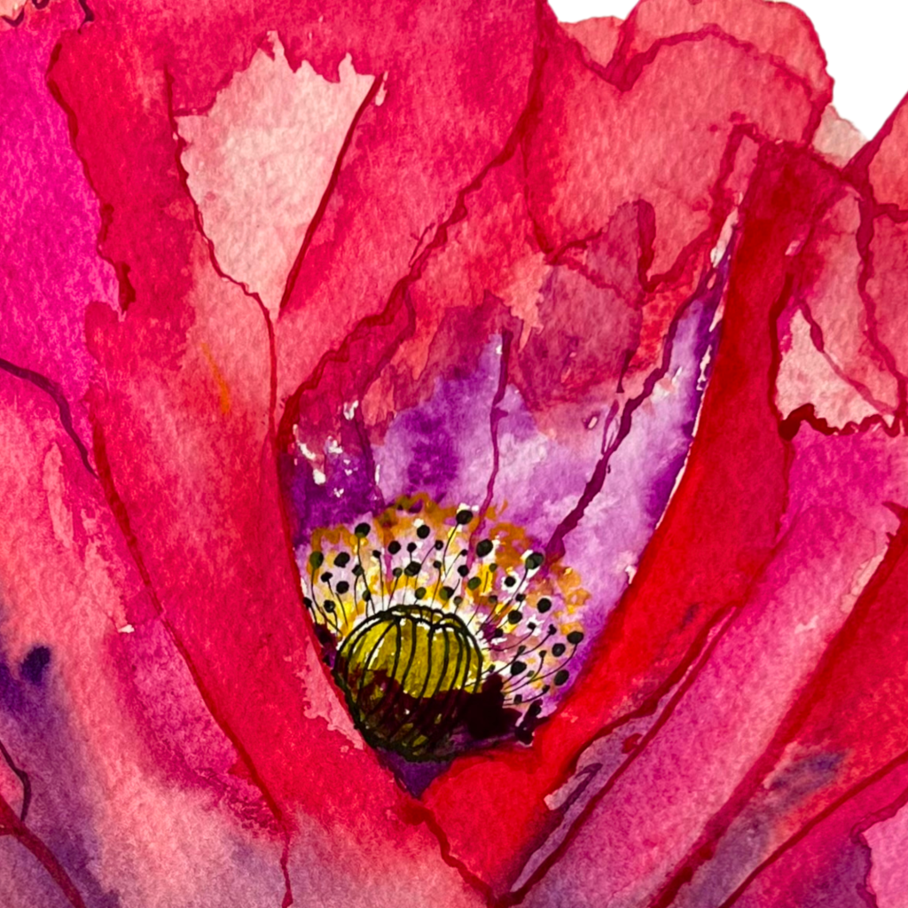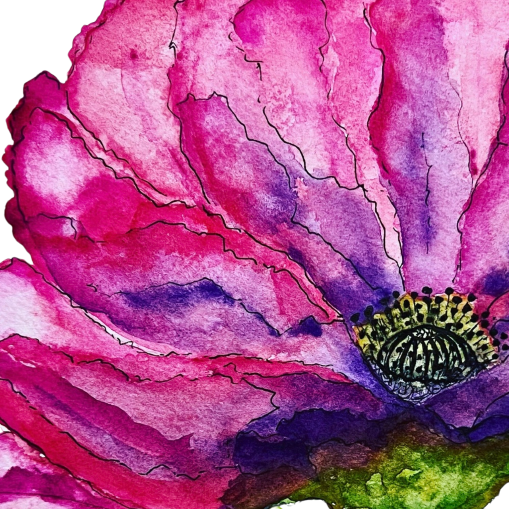 On the other, I love to loosen up and paint florals expressively — letting watercolour flow, ink bleed, colour bloom and mingle on the page. Here, it’s less about accuracy and more about energy, movement and feeling. It becomes intuitive, experimental, and wonderfully freeing, and working with perspective by cropping to make it even more aesthetically appealing.